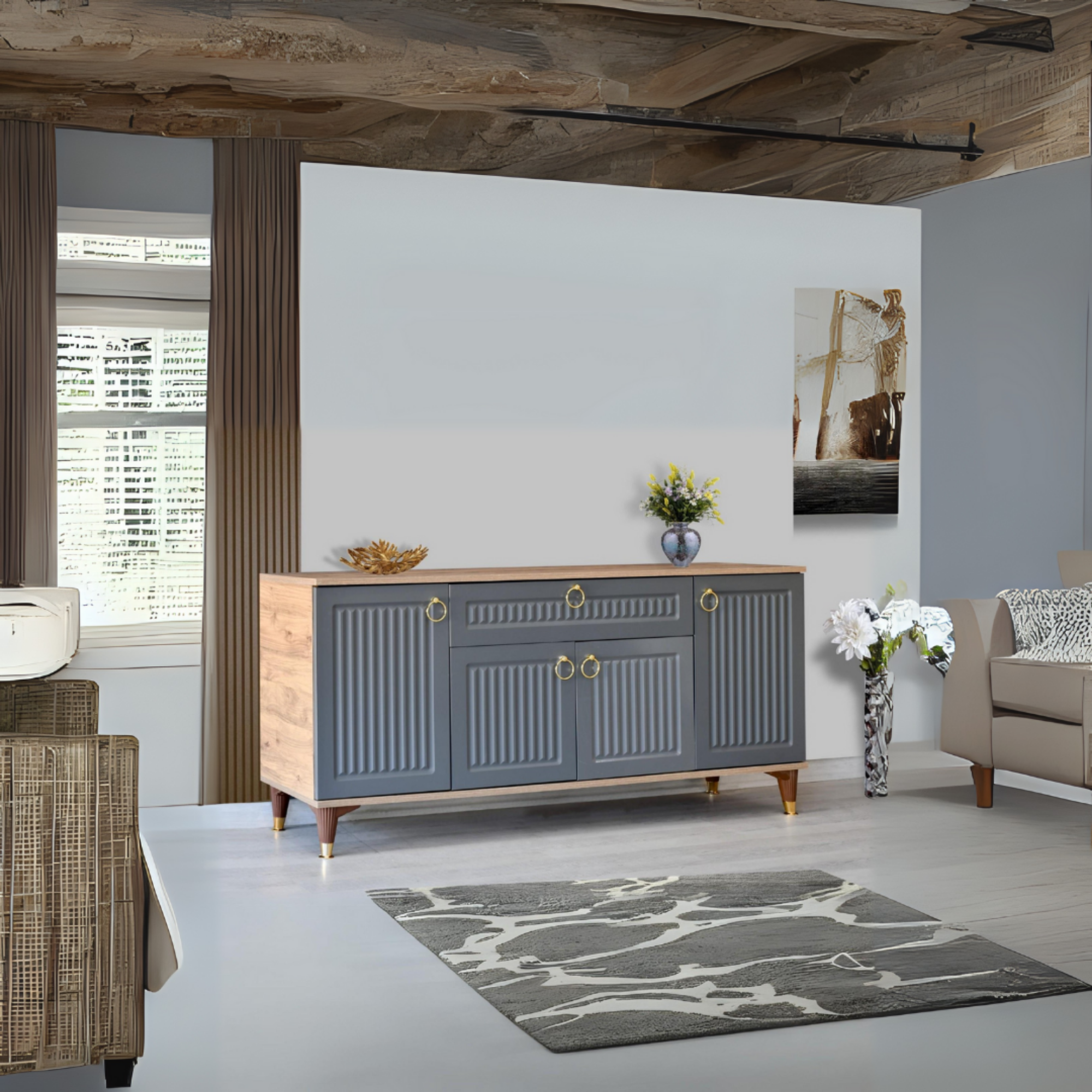 🎨 Renk Antrasit membran kapaklar Atlantik çam gövde gold kulp ve ayak detaylarıyla tamamlanmıştır