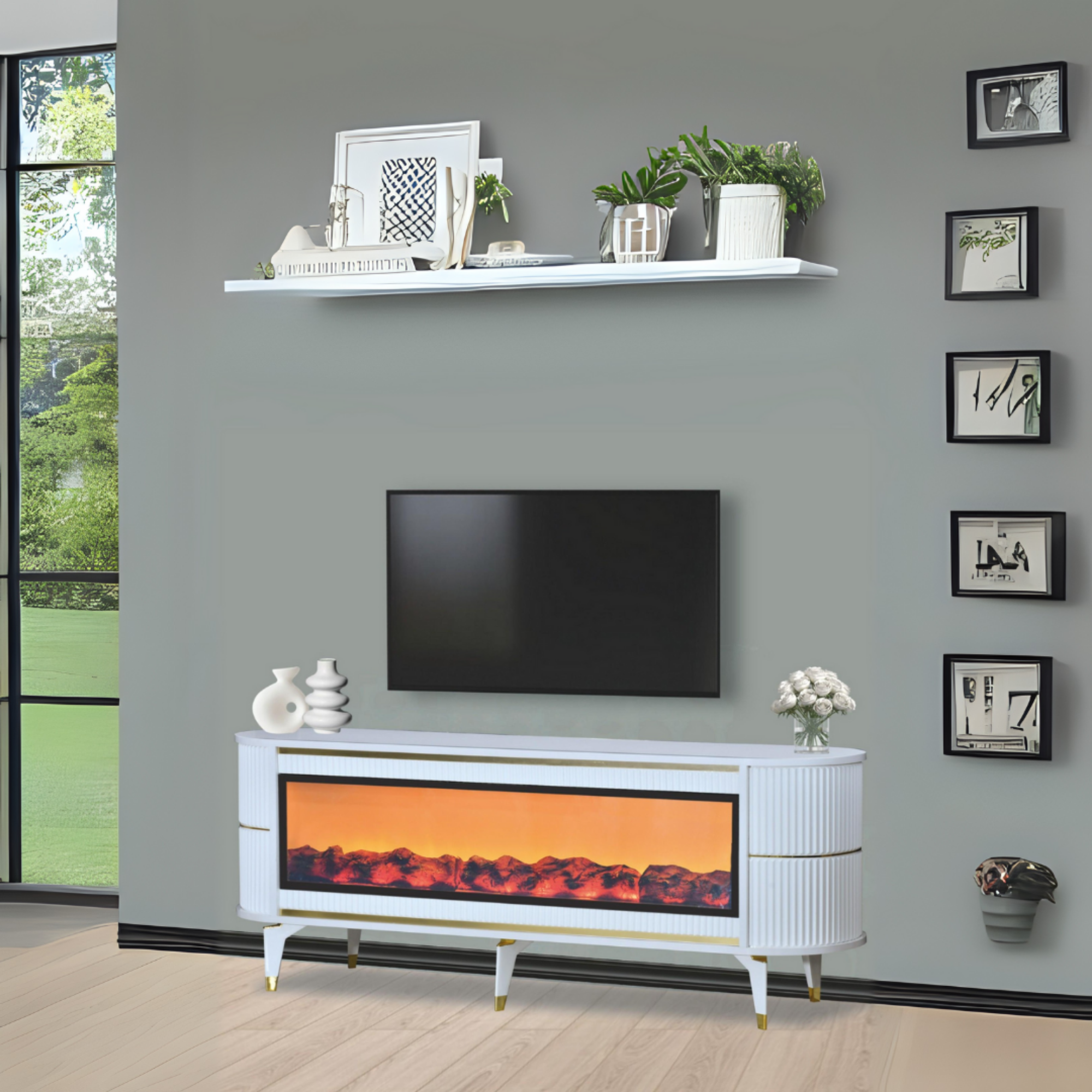 🔥 Dekoratif LED Alev Efektli Şömine teknolojisiyle donatılmış bu beyaz gold TV sehpası, salonunuza hem modern hem sıcak bir atmosfer katar