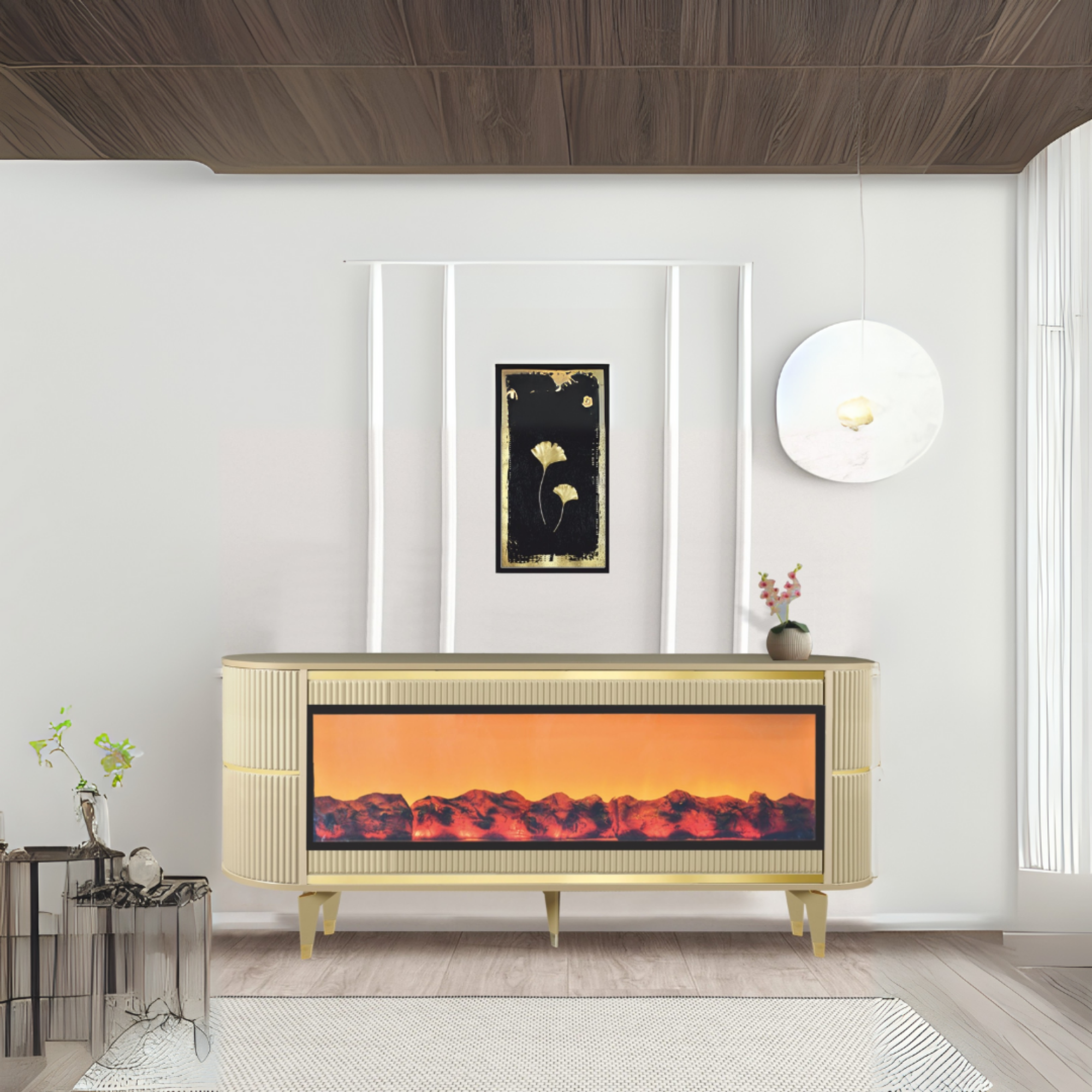 🔥 Dekoratif Şömineli TV Sehpası cappuccino rengi oval tasarımı gold detayları ve teknolojik özellikleriyle salonunuzda hem sıcak hem modern bir hava yaratır