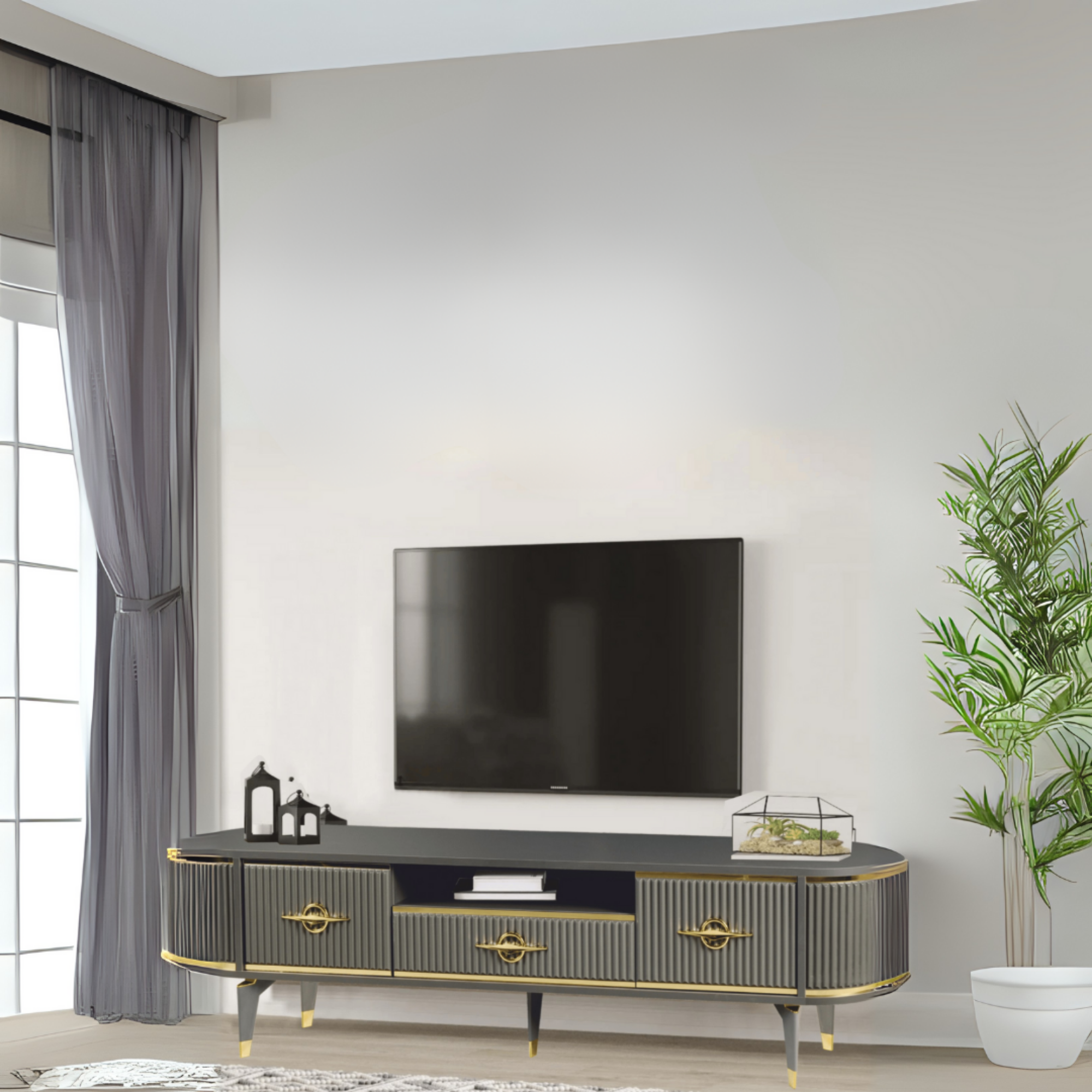 ✨ Duru TV Sehpası , antrasit rengi ve gold detaylarıyla modern salon dekorasyonuna zarif bir dokunuş sağlar. Oval formu ve estetik çizgileriyle öne çıkar.