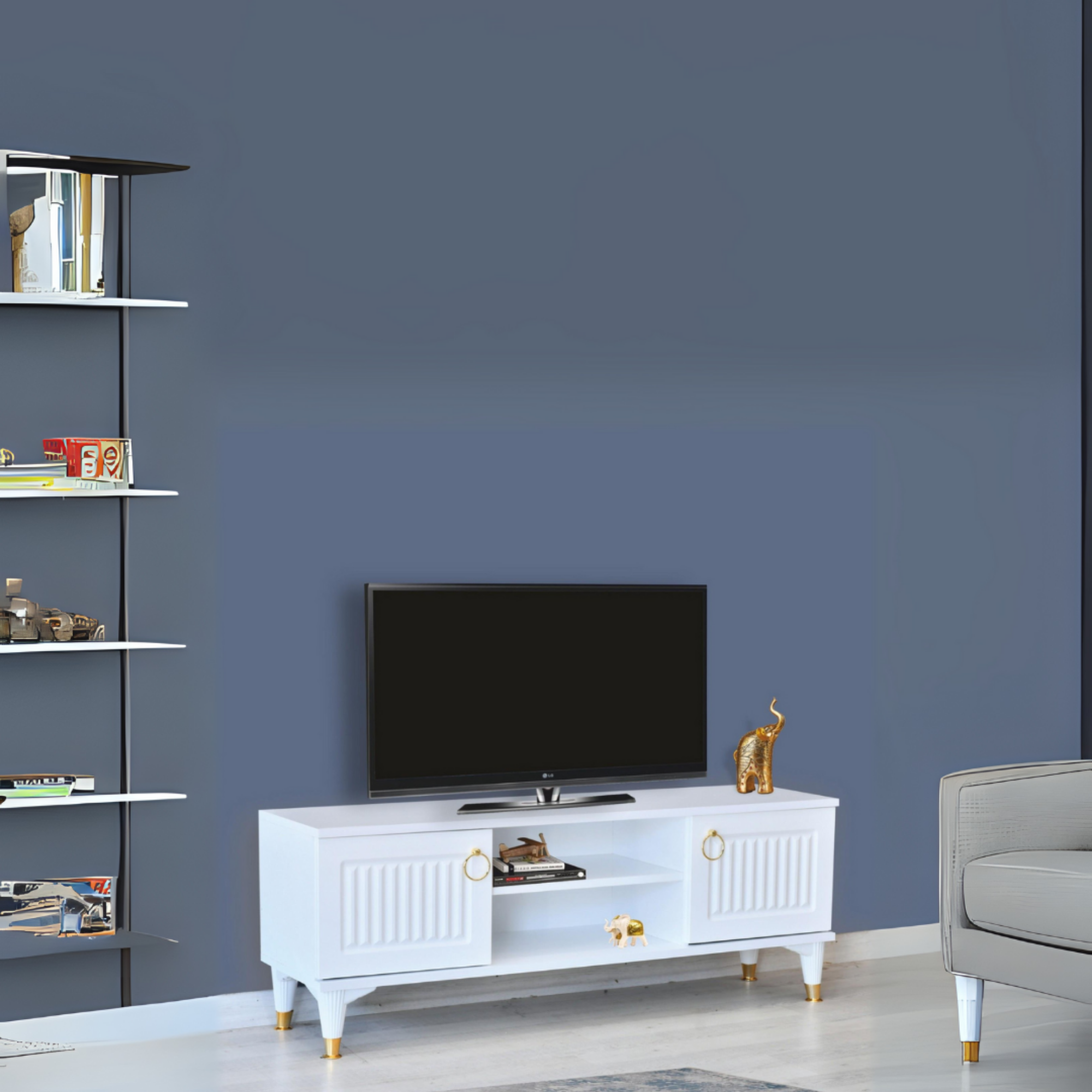 ✨ Eva TV Sehpası , beyaz gövdesi, çizgili membran kapakları ve gold kulp detaylarıyla sade ama şık bir görünüm sunar. Orta raf bölmesi ve iki kapaklı alanıyla günlük kullanım için oldukça pratiktir.