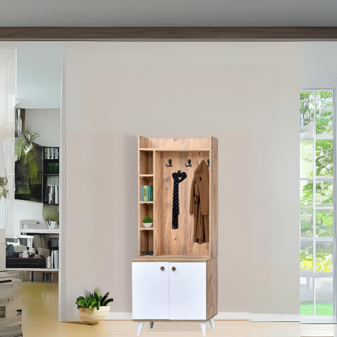 Askılık bölmesi, açık rafları ve alt kısmında 2 kapaklı dolap alanıyla hem mont, atkı gibi eşyaları hem de ayakkabı ve çantaları düzenli şekilde saklamanızı sağlar.