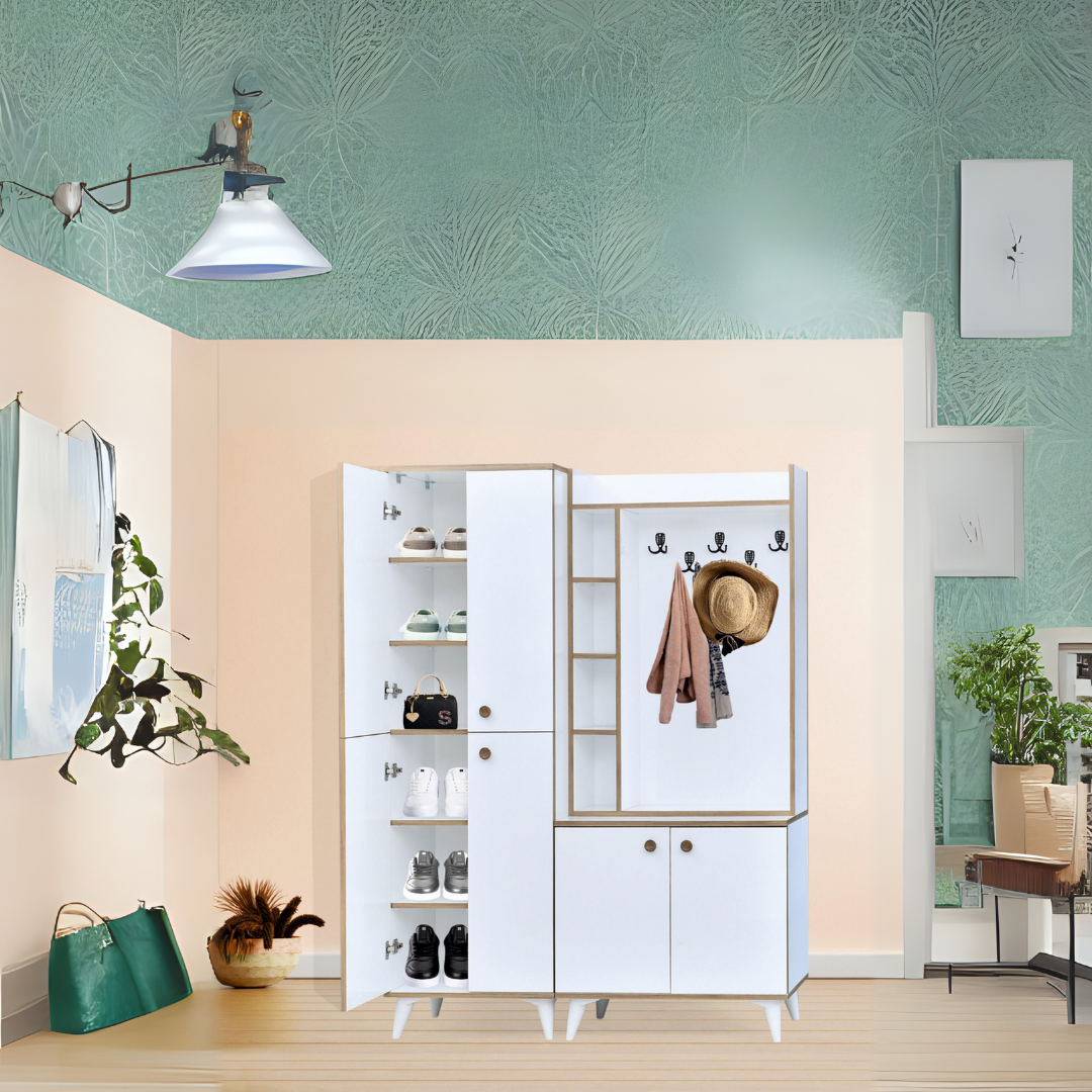 Raflı yapısı, çok bölmeli kapaklı dolapları ve 5 askılık bölmesiyle hem kıyafet hem ayakkabı hem de aksesuar düzeni için idealdir.