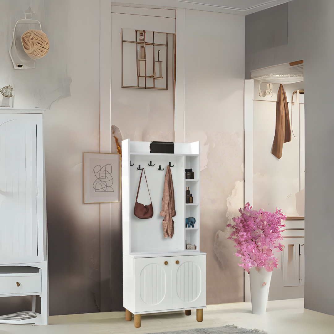 Modern ve sade çizgileriyle dikkat çeken Lidya Portmanto Askılıklı Dolap, hem dekoratif hem işlevsel bir depolama çözümüdür. 🔳 Tamamen beyaz yüzeyi ve minimal detaylarıyla her giriş alanına ferahlık katar. 👚 5'li askı aparatı, mont, çanta ve şallarınızı düzenli şekilde asmanızı sağlar. 📚 Yan bölümdeki raf detayları, anahtar, parfüm, dekoratif obje gibi günlük eşyalar için kullanışlı alan sunar. 👞 Alt dolap kısmı, ayakkabılarınızı göz önünde olmadan saklamanız için idealdir.