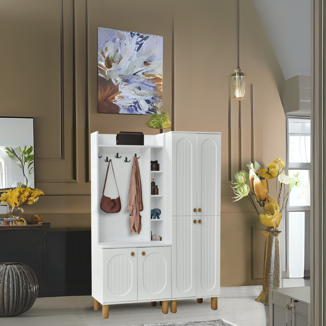 Sade şıklığı ve fonksiyonelliği bir arada sunan Lidya Portmanto Takımı, giriş alanlarınızı düzenli ve ferah bir hale getirir. 🔲 Tamamen beyaz membran kapakları ile modern dekorasyonlara uyum sağlar. 👚 Askılıklar, ceket, şal ve çantalar için pratik kullanım sunar. 📦 Çok bölmeli raflar, anahtar, parfüm veya dekoratif objeler için ideal alan oluşturur. 👟 Alt bölümdeki geniş ayakkabılık dolapları, günlük kullanım kolaylığı sağlar.