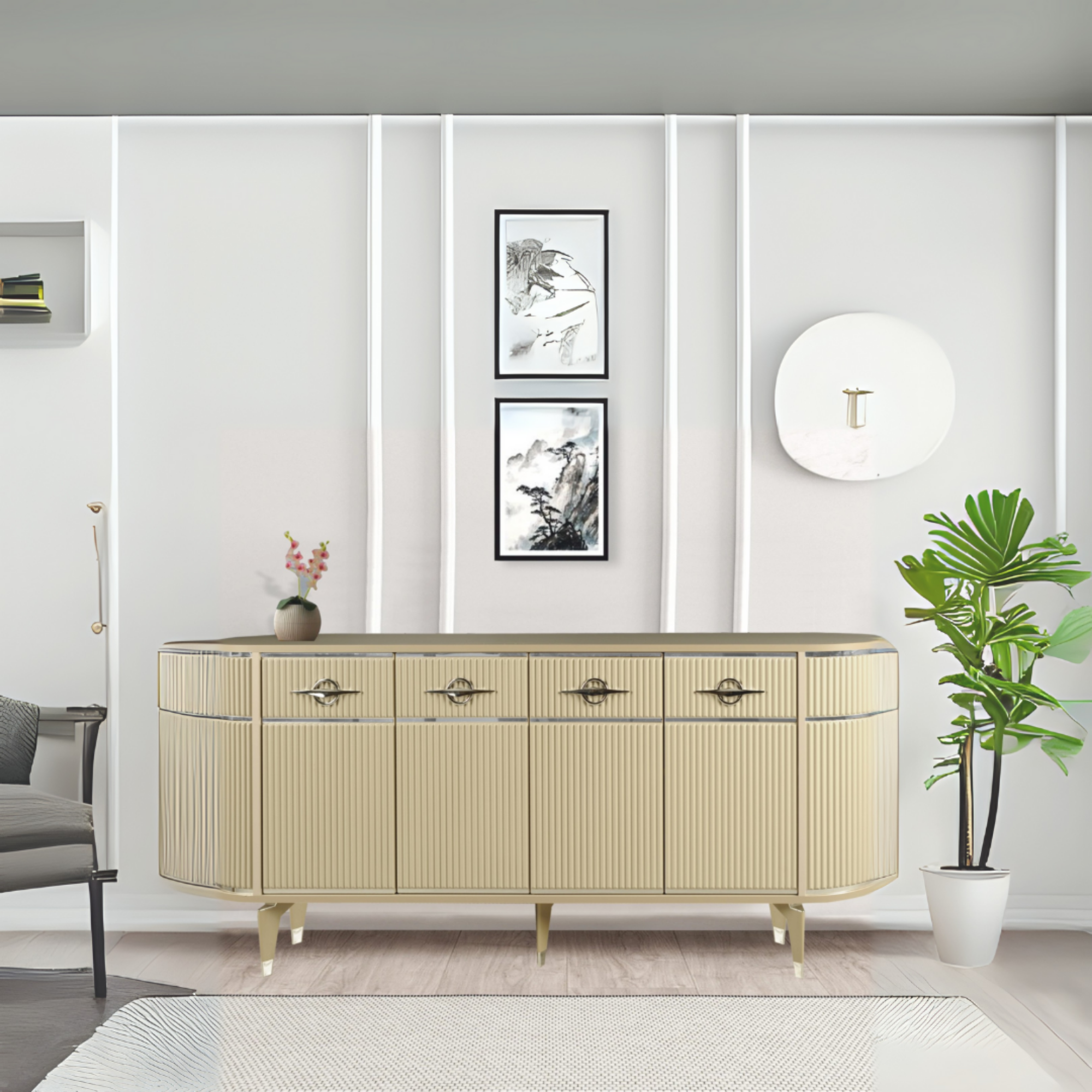 Maya Cappuccino Gümüş Lüks Konsol 4 Kapaklı Şerit Detaylı Metal Ayaklı Tasarım 180x45x84 Cm
