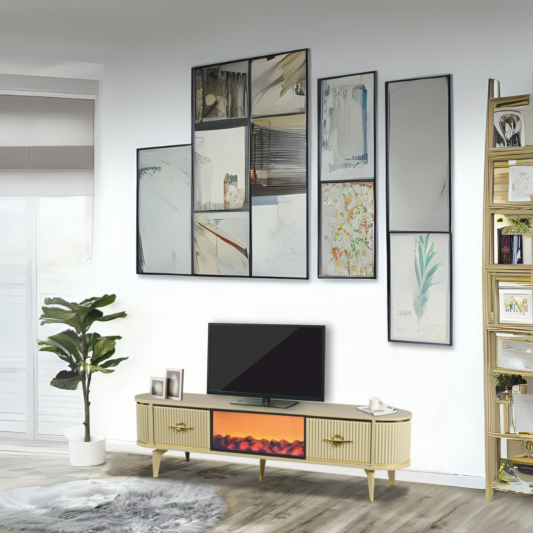 🔥 Ürün Özelliği: Orta kısımda yapay şömine paneli, 2 adet kapaklı alan, oval kenar tasarımı