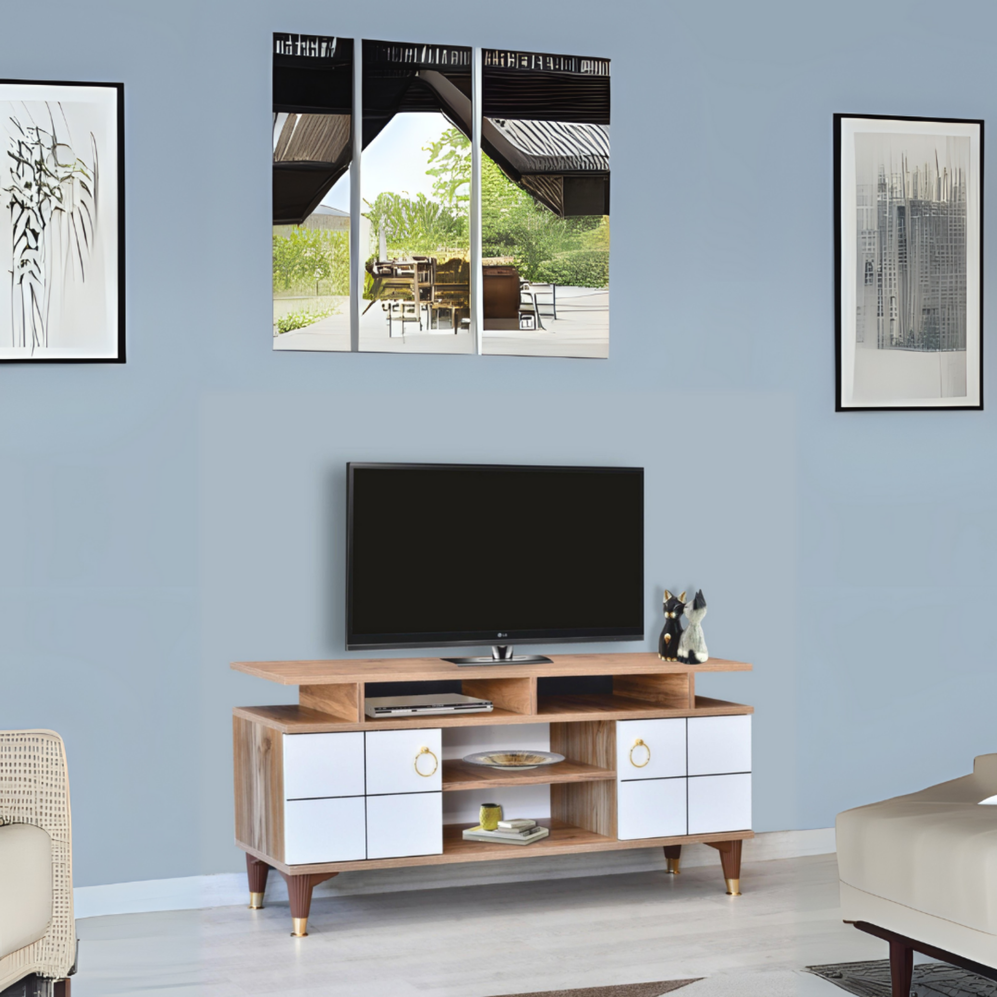 ✨ Mega TV Sehpası , doğal ahşap tonlarıyla modern beyazın birleştiği, hem fonksiyonel hem şık bir tasarımdır. Gold halkalı kulplar ve yüksek ayak yapısı ile estetik bir görünüm sunar.