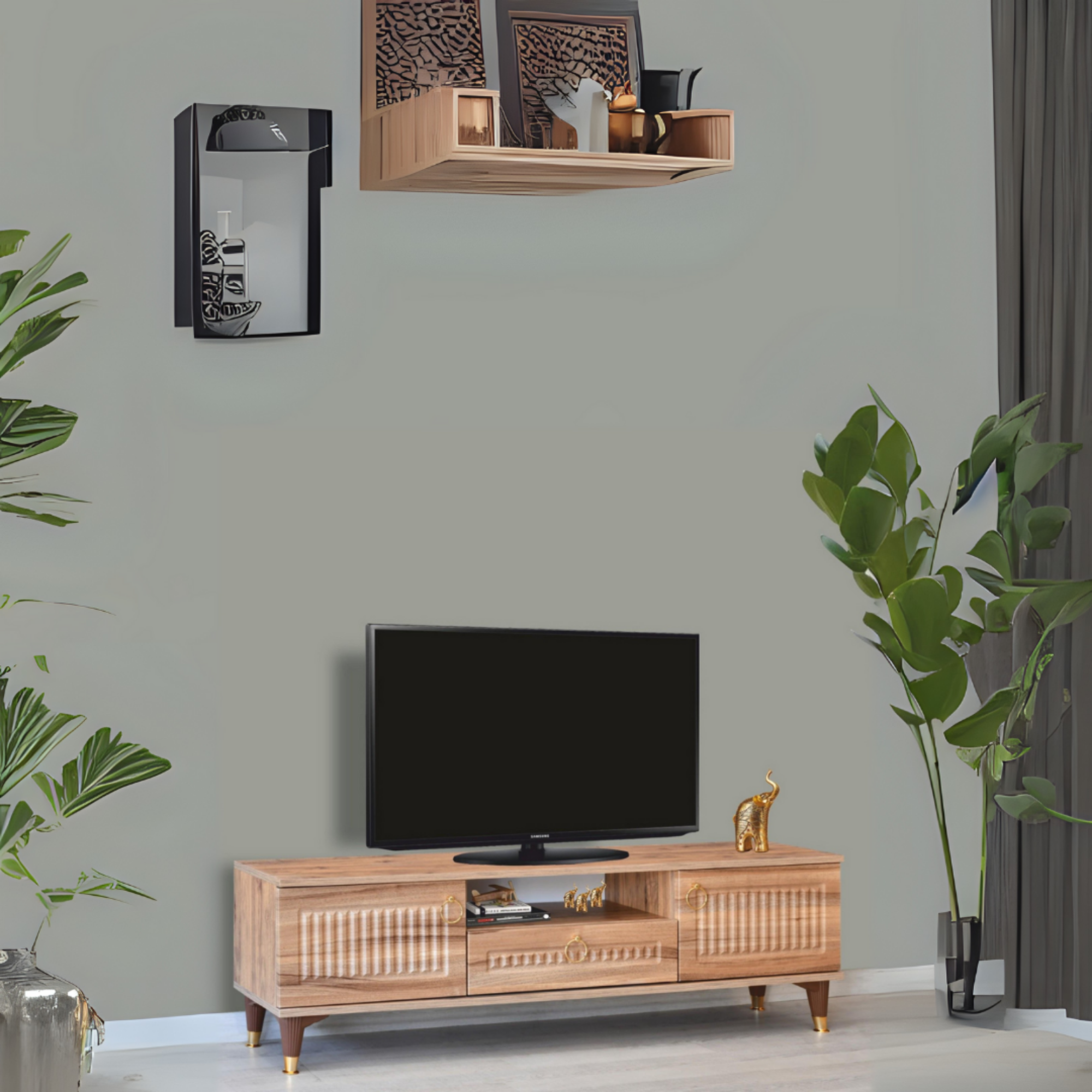 Mindy TV Sehpası , çam desenli gövdesi ve gold detaylı kulplarıyla doğal sıcaklık sunarken, işlevselliğiyle de fark yaratır.