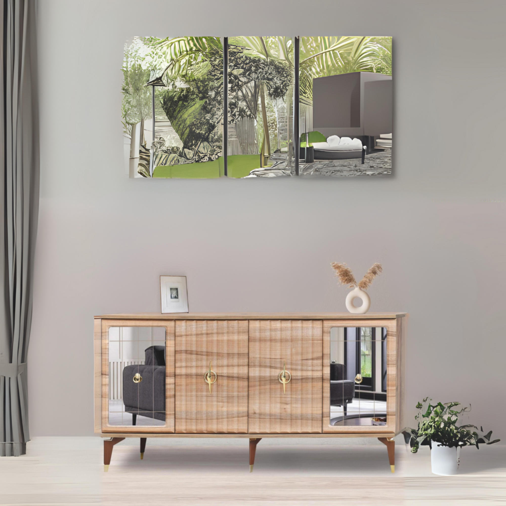 Salon, oturma odası veya yemek odalarında estetik bir depolama çözümüdür. Dış yüzeyindeki ayna detaylarıyla ortamı daha geniş ve şık gösterir. Kapaklı yapısıyla günlük eşya veya sofra düzeni ürünlerini gizli bir şekilde saklamanızı sağlar.