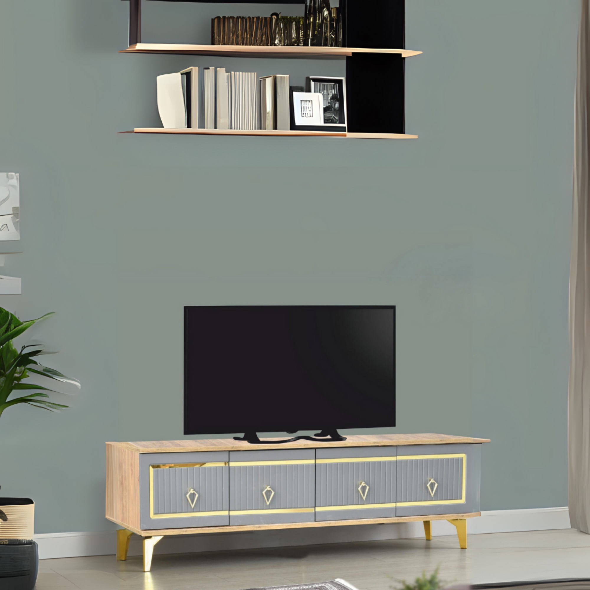 Şık çizgili yüzeyi ve altın detaylarıyla dikkat çeken Vina TV Sehpası , modern ceviz tonuyla salonlara sıcaklık katarken antrasit kapaklarıyla güçlü bir kontrast sunar.