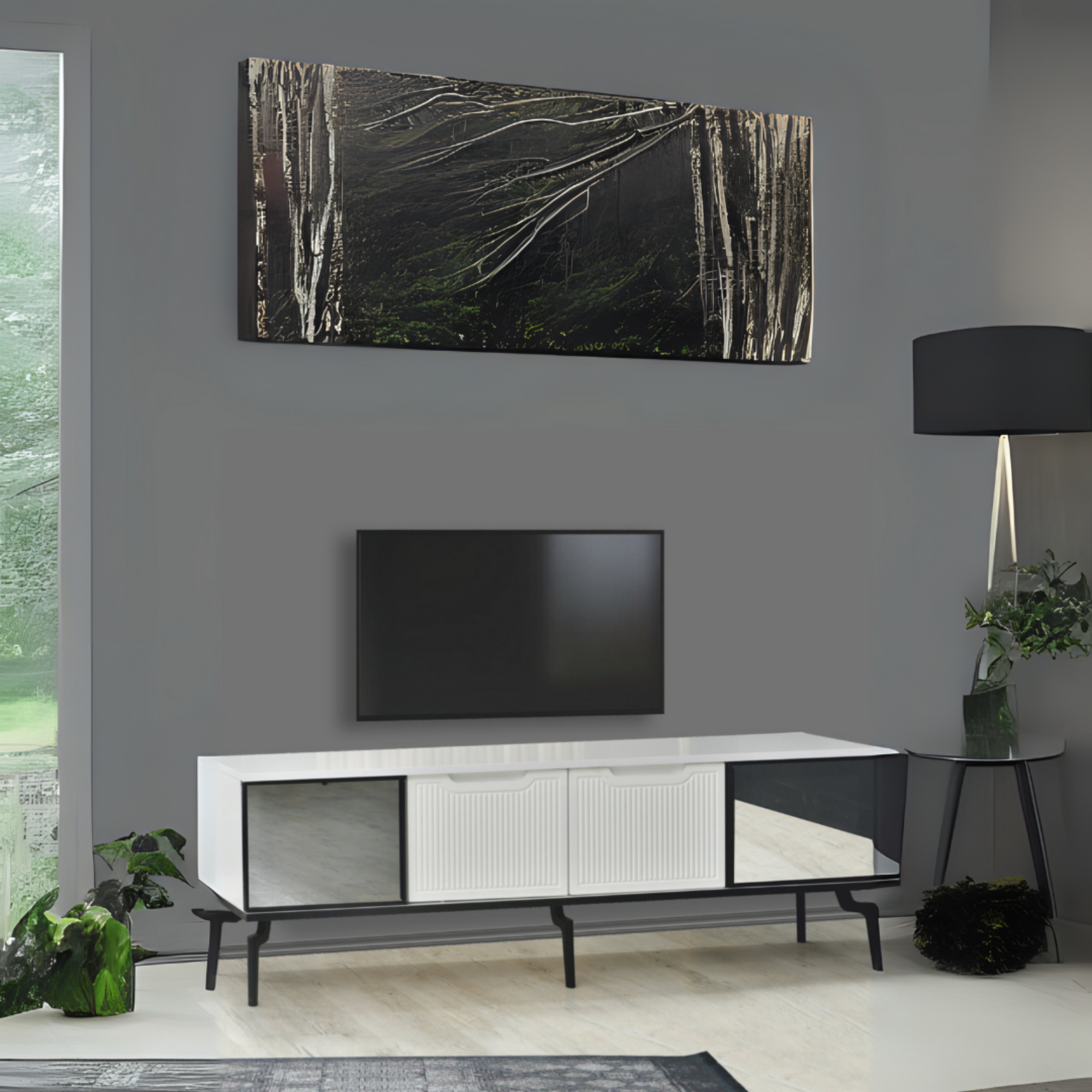 Camlı yüzeyleri ve özel desenli kapaklarıyla hem dekoratif hem fonksiyonel bir TV ünitesidir.